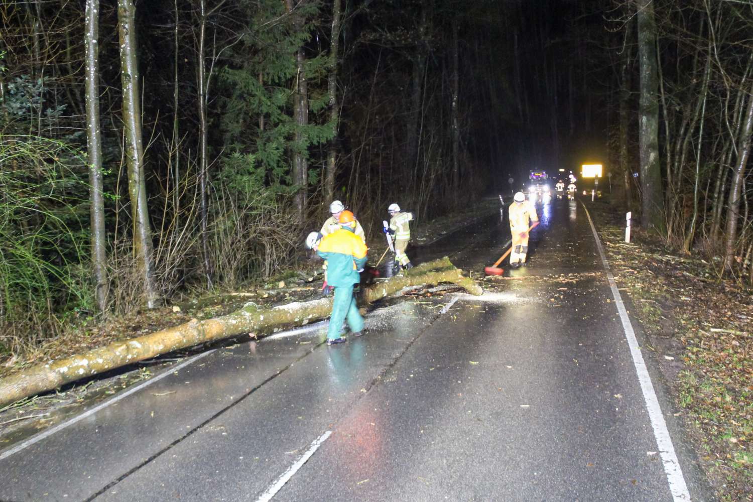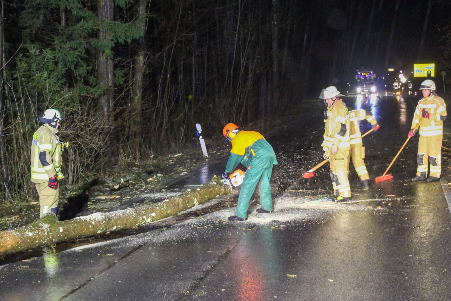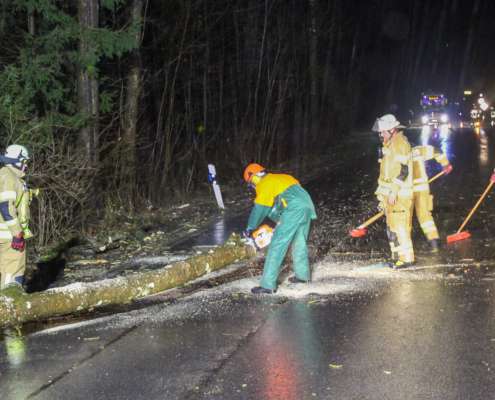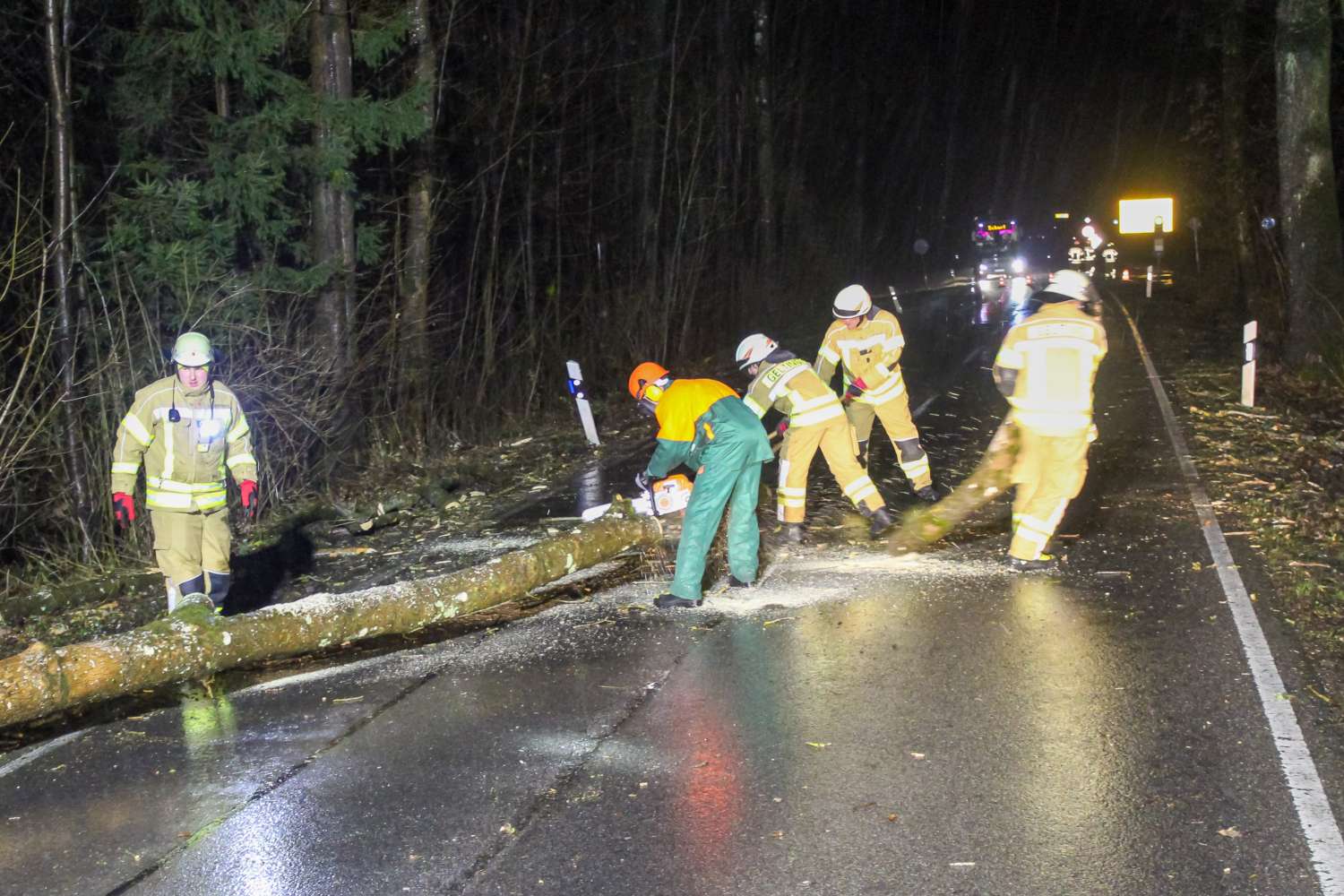 Die Einsatzkräfte der Feuerwehr Gelting richteten eine Vollsperrung der Markt Schwabener Straße in beiden Richtungen ein und entfernten den Baum mittels Motorsäge.